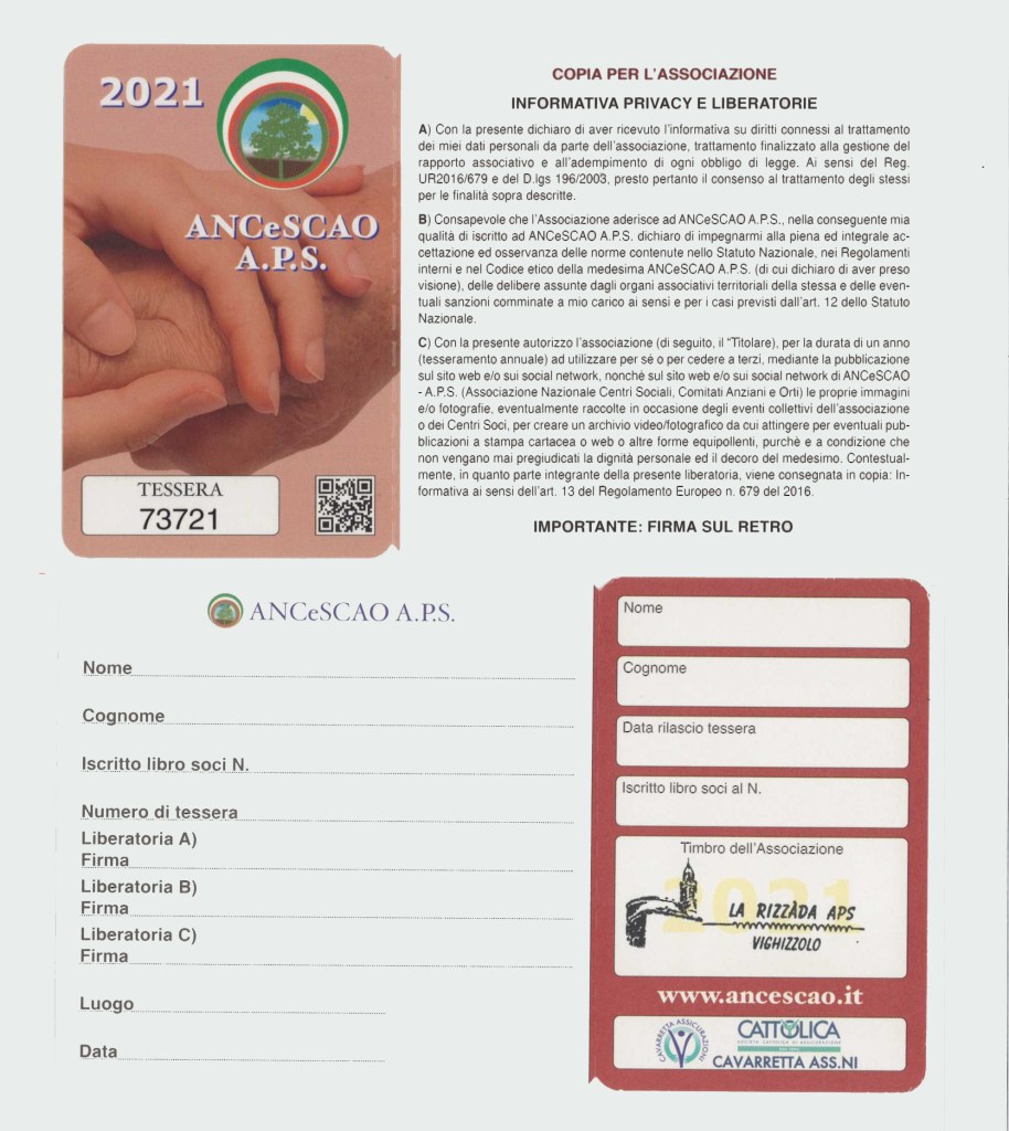 L’importo della tessera per l’anno 2021 è rimasto invariato ad € 12,00 da versare al momento della iscrizione presso la nostra sede in via S.Giuseppe, 24/b a Vighizzolo di Cantù (CO)